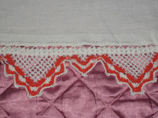 O mesmo pano de prato com dois barrados diferentes,que foram feitos separadamente do pano.Aqui só fiz uma sobreposição dos barrados para ter uma idéia de como ficariam.Ele ficou depois, com o segundo barrado, que minha vizinha costurou com um passa fita, a foto infelizmente não tenho mas podem acreditar, ficou lindo.