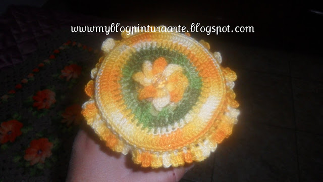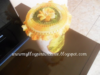 Na tampa, simplesmente fiz essa capinha em crochê com flor catavento e colei...